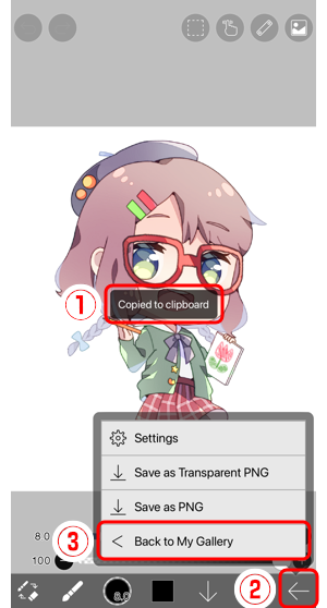 Once it says, ①"Copied to clipboard", the image is copied. Tap the ②Back button. Select ③ Back to My Gallery and go back to My Gallery to paste the copied illustration onto a different illustration.