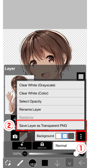 Press the ① … on the Layer windowand tap on ② Save Canvas as Transparent PNG to save the image to the photo library.