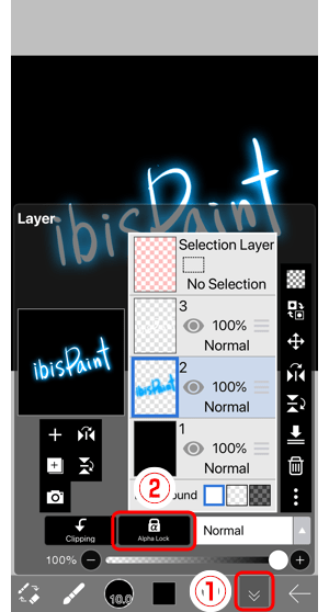 Tap ①Layer window . Turn on ②Alpha Lock and color it with the airbrush to create a gradation like the finished image.