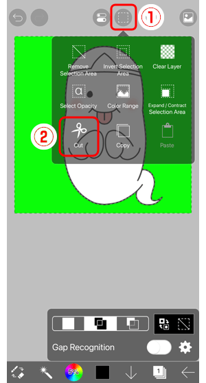 Open the ①Selection Area window. Tap on ②Cut to remove the image part that you don’t need.